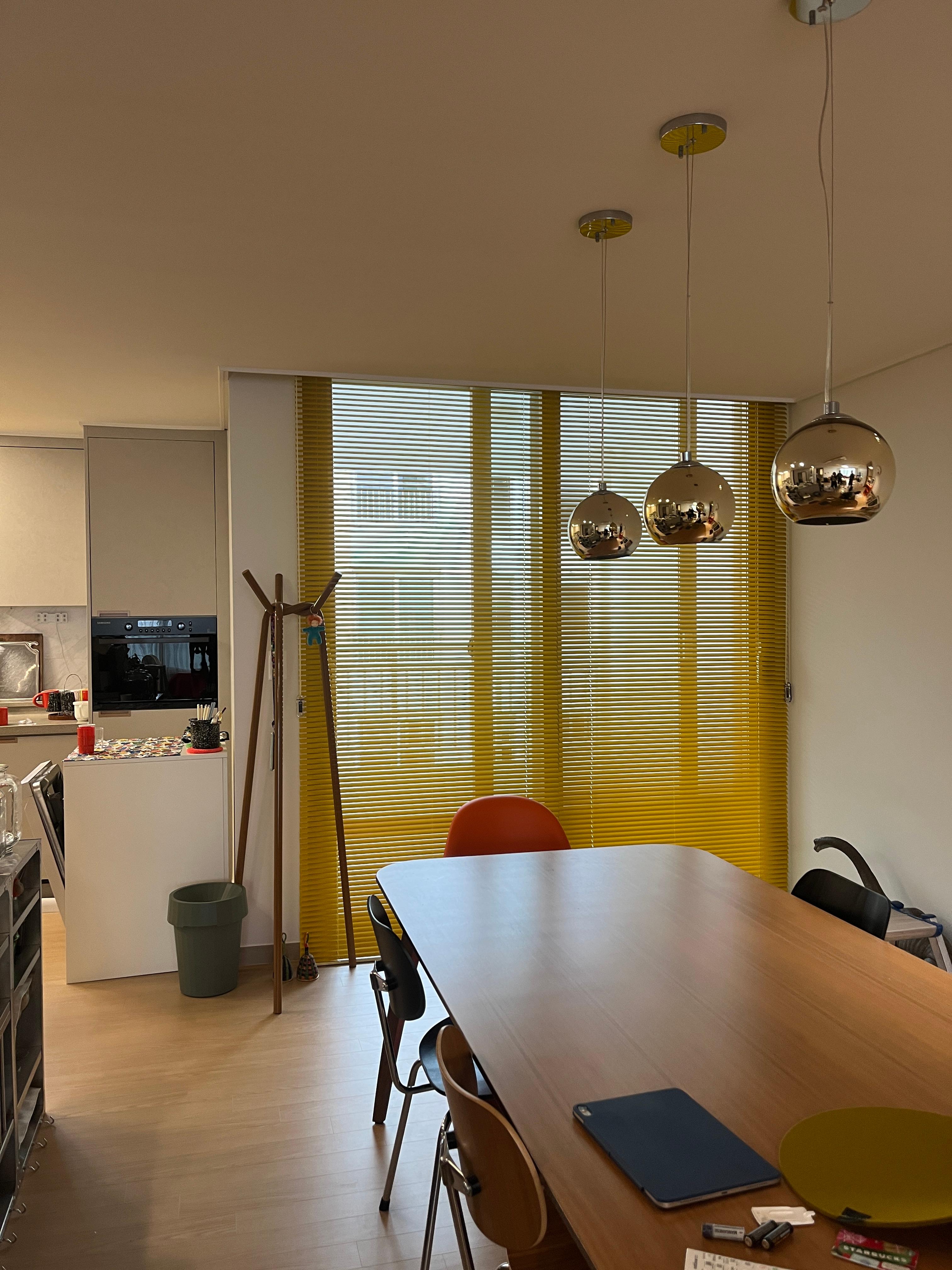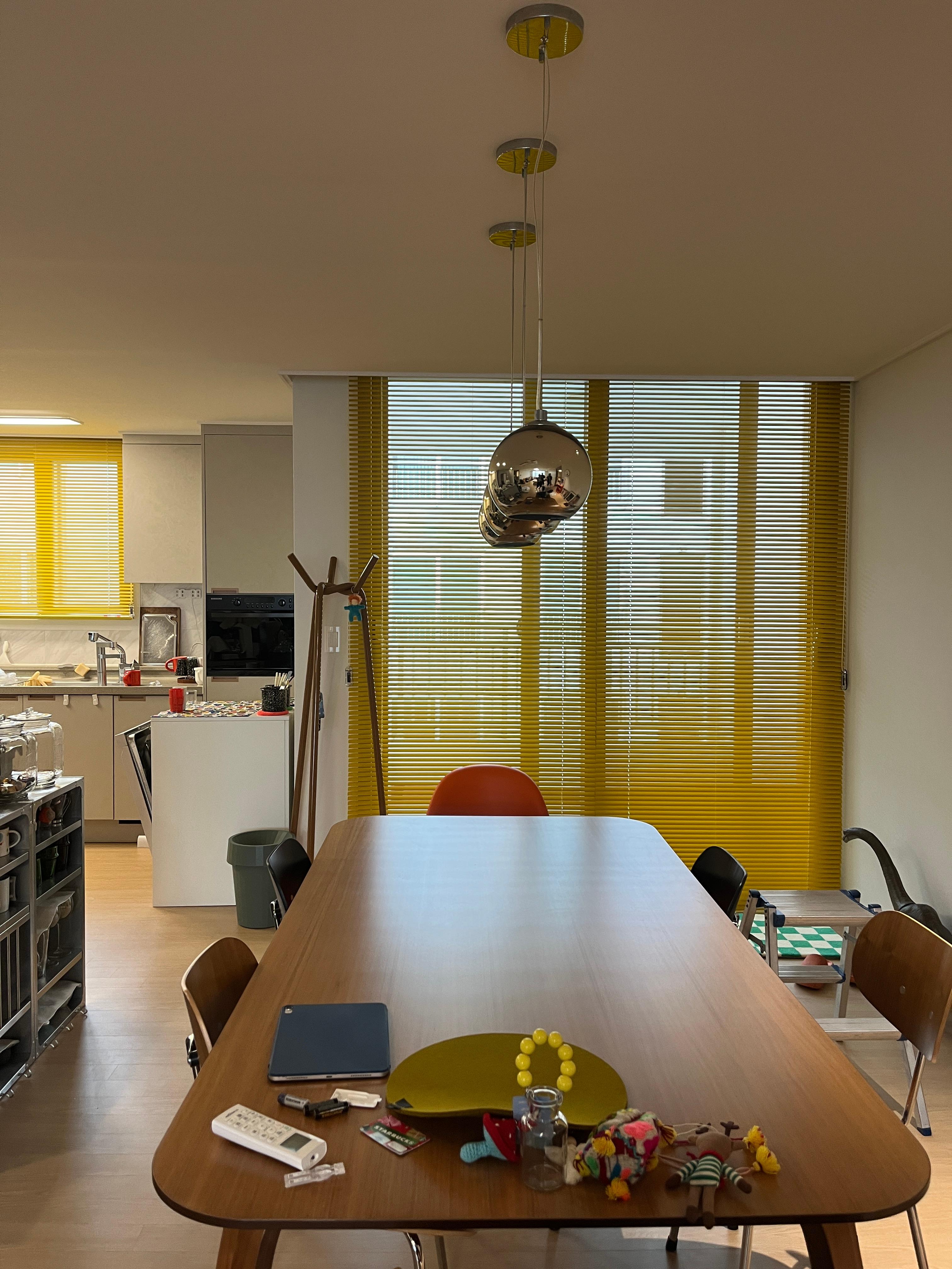 다이닝 공간에 컬러풀한 알루미늄블라인드를 설치했습니다.